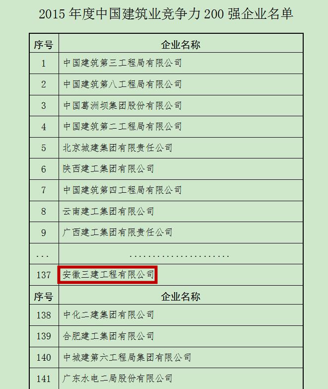 10月12日,经过企业申报、相关行业协会推荐、专家组初审、评价结果公示,中国建筑企业协会终审的“2015年度中国建筑业双200强企业”结果揭晓,安徽三建榜上有名,被授予“2015年度中国建筑业竞争力200强企业”称号,这是该司继连续多年荣获“中国建筑业成长性百强企业称号”后的又一含金量极高的荣誉。