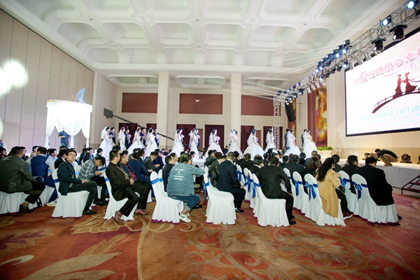 10点10分,一曲精妙绝伦的舞蹈《因为爱情》拉开了集体婚礼的帷幕。率先出场的是十二位帅气的新郎,他们以一段酷炫的舞蹈表达了心中难以抑制的激动,将现场气氛推向高潮。伴着优美的乐曲,十二位美丽的新娘在众人的注视下缓缓步入会场,来到新郎身边。在浪漫的婚礼进行曲中新人们双双进入礼堂,在现场观众的见证下彼此交换信物。随后,美丽的新娘们将手中的捧花抛给在场的单身男女们。
