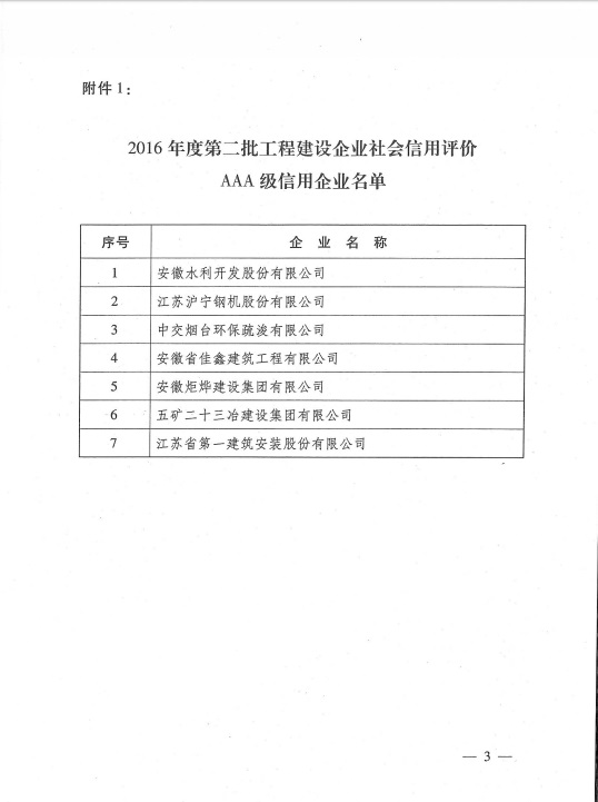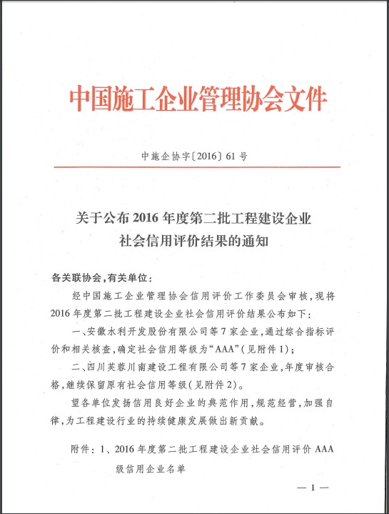 经中国施工企业管理协会信用评价工作委员会审核,安徽水利开发股份有限公司被授予2016年度第二批工程建设企业社会信用评价AAA级信用企业单位。