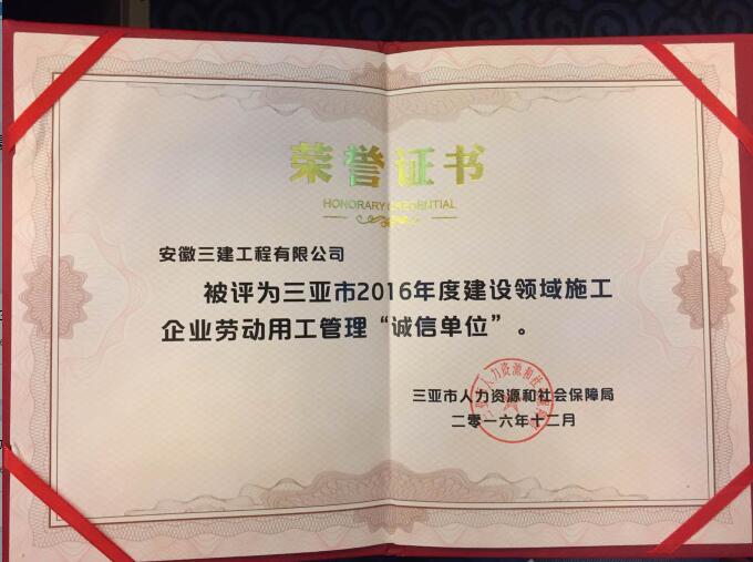 12月1日,从三亚市人力资源和社会保障局获悉,安徽三建公司荣获三亚市2016年度建设领域施工企业劳动用工管理“诚信单位”称号。