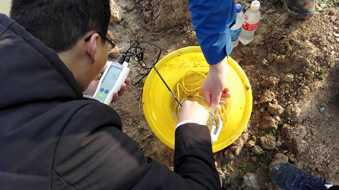 课题组一行在听取项目概况和有关介绍后,实地察看了中湖地质环境治理项目(一期、二期)总体控制性详细规划区域。根据察看结果和背景资料,分析了该科研项目当前紧迫的任务、现场地形地貌和周边环境(特别是水系和塌陷区采空层情况),具体采样工作包括采集土样、水样、沉降观测点的选择,并实时检测了水样的pH值等基础指标等。