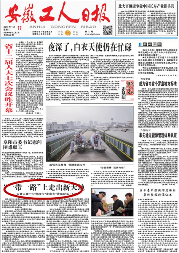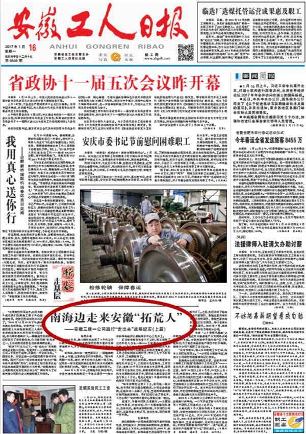 1月16、17日,《安徽工人日报》头版先后刊登了两篇题为《南海边走来安徽“拓荒人”》、《“一带一路”上走出新天地》的文章,对安徽三建一分公司多年来在海南地域拼搏开拓取得成功的过程做了详细报道。