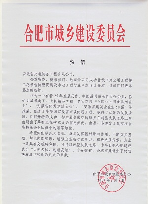 近日,合肥市建委向安徽交航发来贺信,热烈祝贺安徽交航取得市政公用工程施工总承包特级资质及市政行业甲级设计资质。