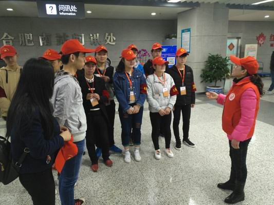 活动开展的三天里,我院学生每天准时准点到达合肥南站询问处,在志愿者培训老师简要介绍工作内容以及要求后,同学们统一领取了帽子和袖章,走上了各自的服务岗位。