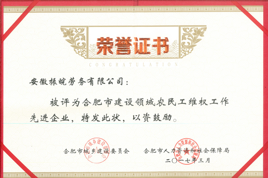 日前,合肥市城乡建设委员会与合肥市人力资源和社会保障局联合发文,表彰2016年度建设领域农民工维权工作突出贡献单位,安徽三建公司所属安徽振皖劳务有限公司荣获合肥市2016年度“建设领域农民工维权工作先进企业”称号。