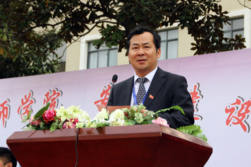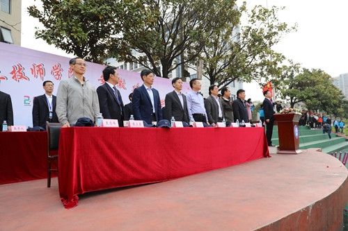 学院党委书记、院长张卫东在开幕式上致词。首先他代表学院向出席运动会开幕式的各级领导表示热烈的欢迎!对本次运动会的举行表示热烈的祝贺!向刻苦训练、积极备战的所有运动员致以崇高的敬意!向辛勤工作的所有裁判员和工作人员致以亲切的问候!他指出,举办运动会,是学院全面推进素质教育,大力开展阳光体育活动,增强学院凝聚力,丰富学院生活的一项重要举措。近年来,在安徽建工集团的正确领导下,在省市人社、教育部门的大力支持下,学院全面贯彻党的教育方针,秉持“高端引领、特色立校、校企融合、重视素养、突出技能”的办学理念,坚持德育为先,在教育教学改革、招生就业、继续教育、技能大赛等方面取得了较好成绩,为社会培养了大批全面发展的实用型高技能人才,为地区经济社会发展做出了积极贡献,赢得了广泛的社会认同,学院的美誉度、知名度和影响力日益扩大。学生在近三年的国家级和省级技能大赛上屡创佳绩,获得国家级银奖1个,铜奖5个,获得省级一等奖10个,二等奖18个,三等奖9个。特别是在刚刚结束的国家级技能大赛选拔赛中,学院有四个项目、九名同学闯入了国赛,充分展示了国家改革与发展示范校、国家高技能人才培训基地的风采和实力。他强调,当前,学院紧紧把握国家大力发展职业教育的契机,全面贯彻落实人社部技工教育“十三五”规划和安徽省建设“技工大省”的规划,积极谋划新校区建设,着力打造国家高技能人才培训基地和世界技能大赛集训基地,推进学院转型升级,狠抓“三风”建设,进一步加强基础管理巩固年建设,全面提升学院内涵,通过增设无人机、高铁服务等新专业以及开展与韩国、德国等国外优秀职业院校和知名企业加强国际合作办学来提高办学层次,增强办学特色,从而提高教学质量和办学品质。同时,学院全面推进教学改革,重点抓好实习实训和一体化教学改革,大力推行德育教育、品行教育和技能教育,努力将同学们培养成个性鲜明、技术过硬、优势特长凸显的高素质高技能型人才。张院长最后希望全体参赛运动员赛出风格、赛出水平, 赛出友谊, 把本次运动会办成一次文明、向上、精彩、成功的体育盛会!