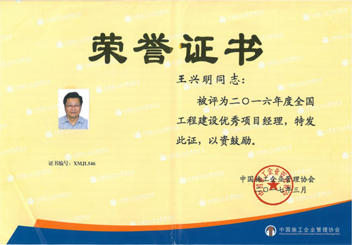 该奖项是由中国施工企业管理协会组织的全国性评优活动,旨在表彰全国工程建设项目管理方面取得突出成绩的先进典型,是建筑施工领域的个人最高荣誉。本次评审经专家对所有参评人员的各项考核指标进行严格的审核和评定后,最终在全国范围内共评出2016年度全国优秀项目经理829名,王兴明是我公司获此殊荣的唯一一名同志。该奖项的获得是对该同志近年来立足岗位、积极发挥技术专长、努力争先创优并作出显著贡献和业绩的肯定。