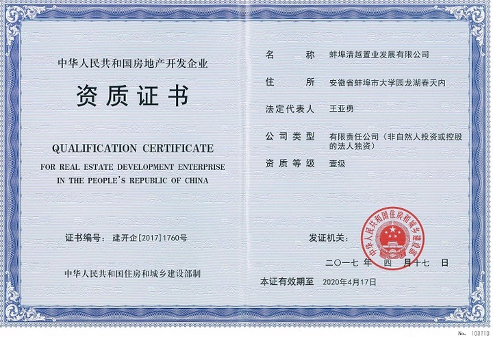 历时近一年,在各级领导大力支持下,经安徽水利和顺地产资质申报专项工作小组的努力,和顺地产全资子公司蚌埠清越置业发展有限公司于近日顺利取得国家房地产开发企业一级资质。