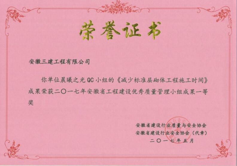 近日,在由安徽省建设行业质量与安全协会与安徽省建设行业安全协会联合举办的安徽省建筑业企业QC小组成果发布会上,安徽三建三分公司“晨曦之光QC小组” 发布的课题《减少标准层砌体工程施工时间》题材新颖、内容充实、演讲精彩,脱颖而出,喜获2017年度安徽省建筑业企业QC小组活动成果一等奖。这是该司长期大力推进QC活动,厚积薄发的硕果。来自全省100多家单位近290个QC小组的代表齐聚一堂,互相竞技。