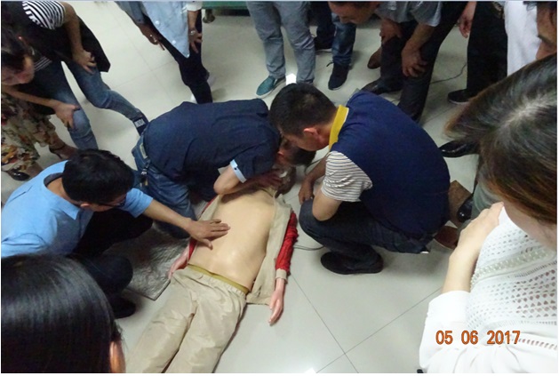 杨军主任首先讲授了心肺复苏的原理和操作的主要步骤,然后现场亲自示范讲解单人如何进行心肺复苏救人,随后参训人员进行现场实际演练。