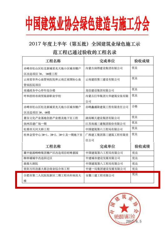 6月6日,由中国建筑业协会绿色建造与施工分会组织对通过绿色施工过程验收的项目进行竣工评审。由安徽三建承建的“合肥市第二人民医院新区二期工程内科病房大楼”项目以优良成绩顺利通过竣工评审,顺利获评"全国建筑业绿色施工示范工程"。