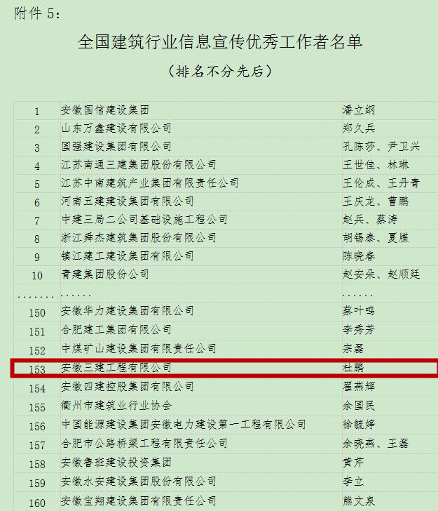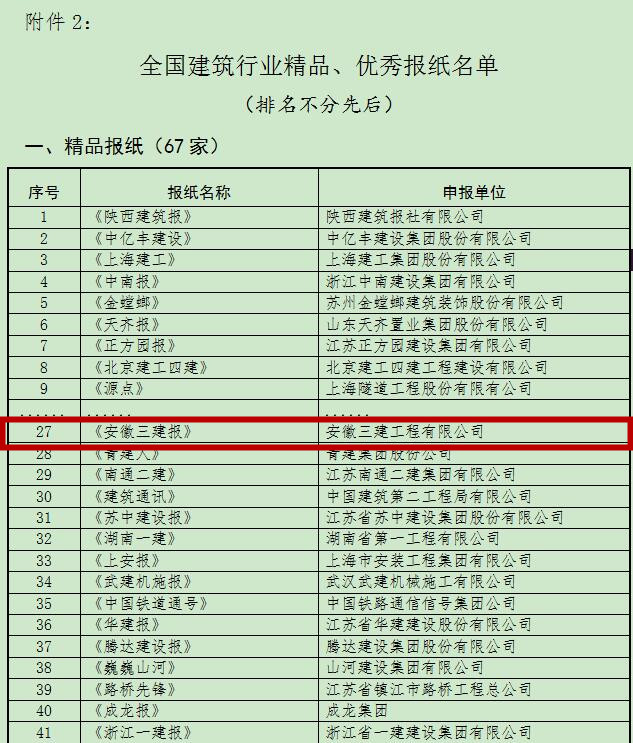 6月15日,从中国建筑业协会获悉,经第七届全国建筑行业信息传媒工作竞赛评审专家组审定,安徽三建公司报纸《安徽三建报》及安徽三建工程有限公司官方网站凭借优质丰富的内容编排、及时高效的更新频率、明快亮眼的版面设计等优势,在全国众多优秀建筑企业选送的参赛作品中脱颖而出,分别荣获“全国建筑行业精品报纸”和“全国建筑行业精品网站”等殊荣;同时该司党委工作部杜鹏同志获“全国建筑行业信息宣传优秀工作者”荣誉称号。