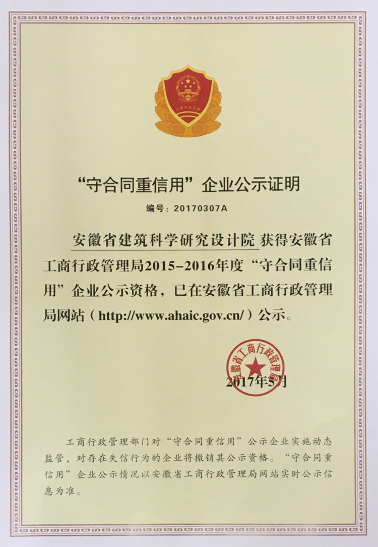近日,经安徽省工商行政管理局评定公示,安徽省建科院、省质检二站荣获2015-2016年度省级“守合同重信用”企业荣誉称号。