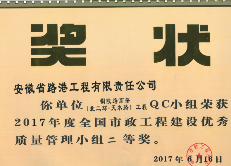 安徽路港铜陵路高架QC小组荣获2017年度全国市政工程建设优秀质量管理小组二等奖