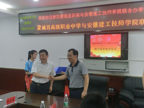 6月22日,安徽建工技师学院与蒙城县高级职业中学合作办学签字揭牌仪式在蒙城举行。亳州市教育局副局长方显启、职成科科长王丙超,蒙城县教育局局长白学军、副局长戴雷、职成科科长李春联;蒙城职高校长方振勇、副校长王学聘;学院张卫东院长、任建设副院长、招生就业处吴成群处长等出席签字揭牌仪式。签字仪式由蒙城职高王学聘副校长主持。