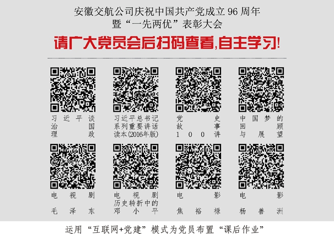 会后,安徽交航公司党委为全体党员布置了“课外作业”,即利用业余时间扫描二维码自主学习习近平总书记系列重要讲话特别是视察安徽重要讲话精神以及党的光辉历史和最新时事政治。近年来,随着“互联网+”思维的不断深化,安徽交航公司党委有效运用“互联网+党建”模式开展各项工作,积极把“互联网+”思维内化为创新党建工作的驱动力,主动抢占“指尖阵地”,努力打造“口袋党建”!