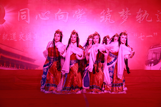 6月下旬,安徽交航合肥轨道交通4号线TJ03项目部接到演出邀请后,公司领导十分重视,公司工会积极组织职工排练节目。经过5天的紧张排练,该节目顺利通过合肥轨道公司的初审、二审,从38个节目中脱颖而出,成为15个参演节目中一朵靓丽的小花,在合肥5条轨道交通线四五十家施工企业中只有安徽交航、安徽路桥、中铁四局等9家单位参演。欢快的舞曲、鲜明的节奏及歌颂的词句展现出在解放西藏“一面进军、一面修路”的战斗中,在实现民主改革的日子里,在边疆自卫反击的战场上,解放军和藏族人民结下的鱼水情意。演员们用饱满的情绪和奔放的舞姿将演出推向高潮。