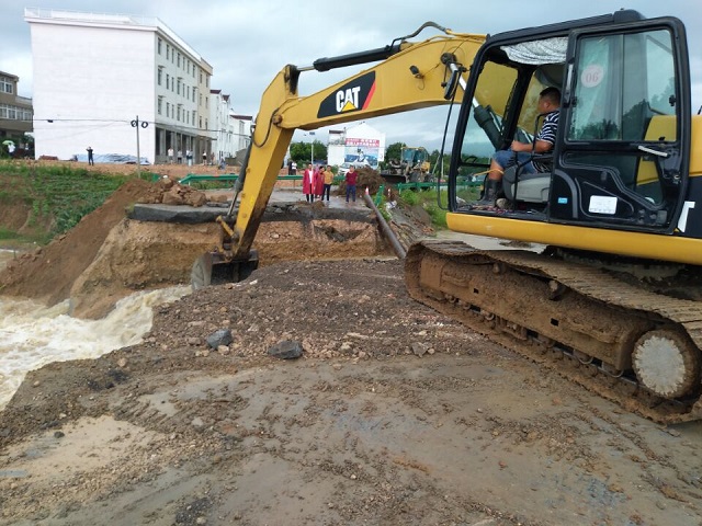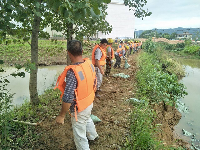 在2日凌晨1点接到当地政府的抗洪抢险通知后,安徽路港G347普枞段LJ-06标项目部立即启动防汛应急预案,迅速组织人员就位,开始抗洪抢险工作。项目部领导班子和全体党员、团员青年组成了抗洪抢险突击队,带着机械设备沿线排水泄洪,保障水系畅通,及时缓解道路积水。装泥沙、运沙袋、码沙袋,大家众志成城、万众一心、同心同德、沉着应对,与洪水进行了一场严酷的较量。