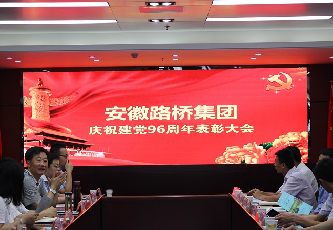 为庆祝中国共产党成立 96 周年,进一步推进公司基层党组织标准化建设,充分发挥党支部的战斗堡垒作用和党员的先锋模范作用,推动公司持续健康发展, 7月1日,安徽路桥集团党委召开庆祝建党96周年表彰大会。公司领导班子成员、中层管理人员、项目经理及受表彰人员参加会议,公司党委委员、纪委书记、工会主席王胜利主持会议。