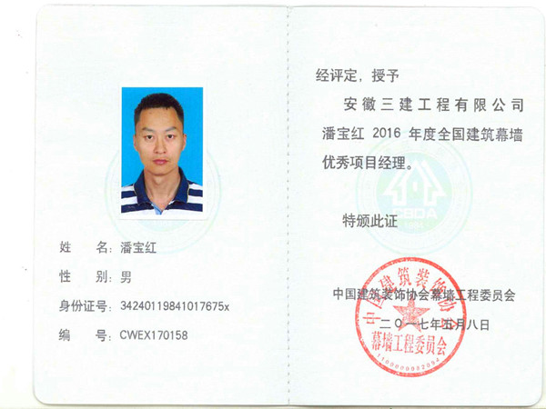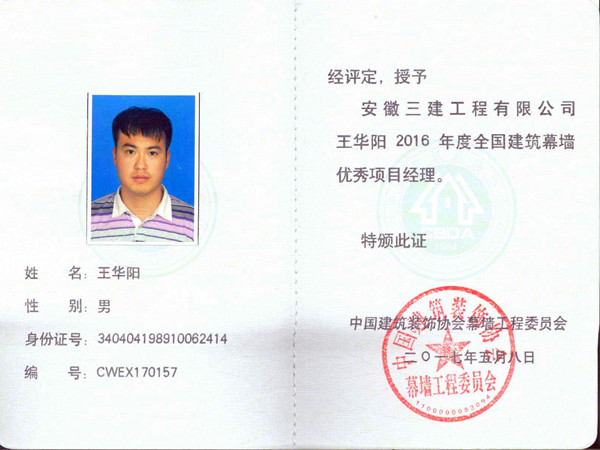 2017年6月在第十届中国建筑幕墙设计师大会上,安徽三建装饰公司王华阳、潘宝红两位同志荣获“2017年中国建筑幕墙优秀项目经理”称号。同时安徽省建筑装饰协会在其官网上发布喜讯:该司万和生、高莉等11名同志荣获“2015-2016年度安徽省建筑装饰优秀项目经理”称号。