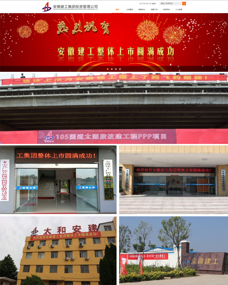 7月3日,安建投资公司网站当即在首页显要位置推出集团整体上市消息。各项目公司第一时间组织参建单位进行标语制作和展示,舒城安建、太和安建、广德新凤公司在项目公司驻地、施工一线现场通过标语横幅、LED、电子屏幕、宣传栏、宣传橱窗、宣传展板等各类媒介渠道进行广泛宣传,及时将集团上市信息传递到地方政府、主管部门、业务伙伴和一线施工人员当中。除此之外,淮北安建还在淮北市入城主干道人民路旁悬挂横幅6条并设置展示宣传板、电子显示屏各一块,扩大宣传范围,将宣传工作落实到实处。