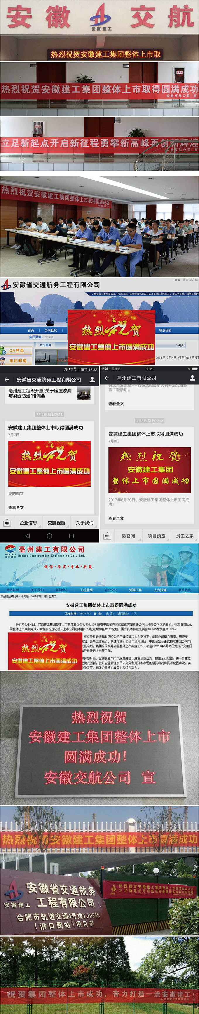 值得关注的是,安徽交航公司在此次宣传工作中激活载体、拓宽渠道,合理运用“互联网+”等创新形式广泛宣传。公司及亳州建工官方网站浮动显示集团公司整体上市成功要闻;“安徽省交通航务工程有限公司”“亳州建工有限公司”“合肥市轨道交通4号线TJ03标项目部”等微信公众号同步推送集团公司整体上市成功喜讯;“交航先锋”(公司官方QQ群)及所属各单位、机关各部室QQ群,“交航先锋”(公司官方微信群)及所属各单位、机关各部室微信群及时发布集团公司整体上市成功消息,力争做到全员知悉、不留死角,全面覆盖、举司同庆!诸如此类的“移动式”线上宣传与“固态化”线下宣传充分联动、形成合力,有力有序有效构建“立体化”宣传格局,大大增强了此次宣传工作的广度、力度、深度和精度,是“互联网+”“大数据”“移动阅读”等新媒体时代背景下的一次成功宣传案例!