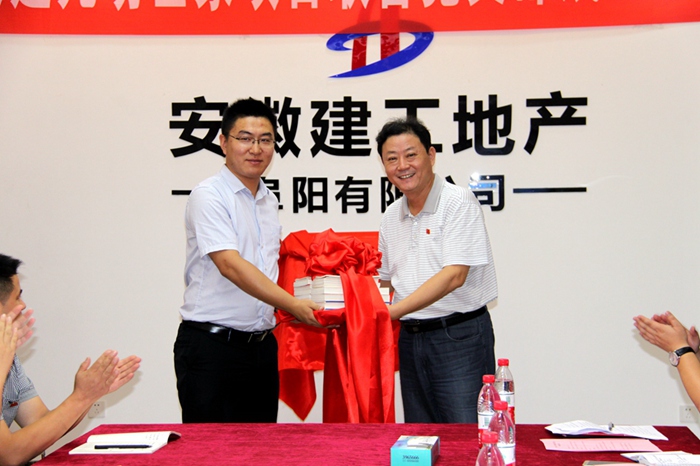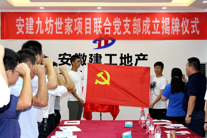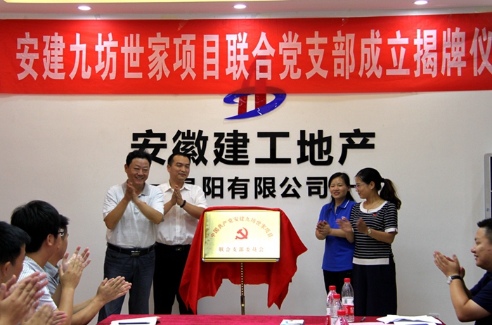 2017年7月25日上午,安建·九坊世家项目联合党支部揭牌仪式在九坊世家售楼中心会议室圆满举行。安徽水利党委副书记、纪委书记戴树明,安徽三建党委副书记黄丽春,安建地产党委委员、纪委书记陈小群,建工集团党委工作部陈楠等出席了仪式。安建地产阜阳公司党支部书记、总经理周鑫主持仪式。