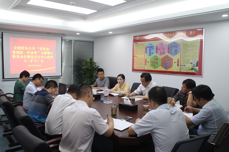 7月26日上午,安建财务公司召开 “讲政治、重规矩、作表率”专题警示教育动员暨党总支中心组学习(扩大)会。会议由公司党总支书记、副总经理潘琳主持,总经理、党总支副书记李有贵,副总经理、纪检委员于忠山出席了会议。公司机关中层管理人员,保理公司、小贷公司党支部书记及支委参加了会议。