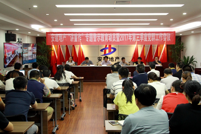 2017年7月28日,安建地产“讲重作”专题警示教育动员暨2017年第三季度党群工作例会在安建国际大厦21楼第三会议室召开,公司领导班子成员、各支部书记、各办事处负责人、公司机关全体党员、设计院支部全体党员参加会议,安建地产党委委员、纪委书记陈小群主持会议。