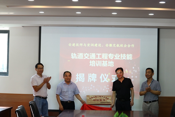 2017年8月27日下午,在合肥市轨道交通4号线TJ03标项目部二号会议室隆重举行安徽建工技师学院轨道交通工程专业技能培训基地成立暨揭牌仪式。会议由安徽省交通航务工程有限公司副总经理侯力主持,安徽建工技师学院党委委员、副院长任建设,安徽省交通航务工程有限公司副总经理汪崇龙、宏润建设集团股份有限公司常务副经理翁厚洋出席签约和揭牌仪式。