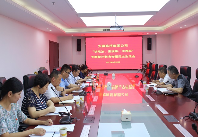 按照集团党委《关于在推进“两学一做”学习教育常态化制度化中开展“讲政治、重规矩、作表率”专题教育的实施方案》部署要求,安徽路桥集团于8月28日召开公司领导班子“讲政治、重规矩、作表率”警示教育专题民主生活会,党委书记、董事长、总经理盛明宏主持会议,公司领导班子全体成员参加会议。建工集团纪委书记宋志华、纪委副书记龚志酬到会指导。