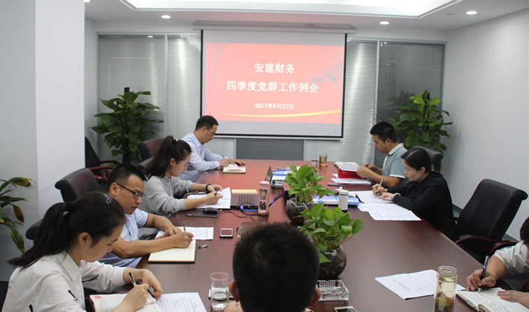 9月27日,安建财务公司党总支组织召开了四季度党群工作例会。会议由党总支书记、副总经理潘琳主持,公司党总支委员、副总经理于忠山出席会议。公司党群部门相关人员及所属各单位党支部书记、支委等参加会议。