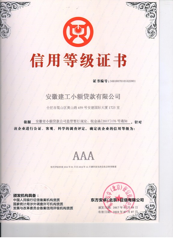 春华秋实,金桂飘香,继2017年10月全省小额贷款公司监管工作会议上安徽建工小额贷款有限公司(以下简称安建小贷)被安徽省政府金融工作办公室表扬之后,又再次传来喜讯:在省金融办组织的2016年信用等级评定中,安建小贷首次荣获行业最高“AAA”等级信用证书(全省413家公司中仅14家获得)。这充分体现了省、市各级金融监管部门对安建小贷经营管理、风险控制、业务模式等各项基础工作的认可,也是对安建小贷从事集团内部供应链业务的高度肯定。
