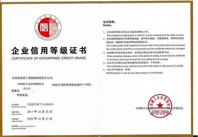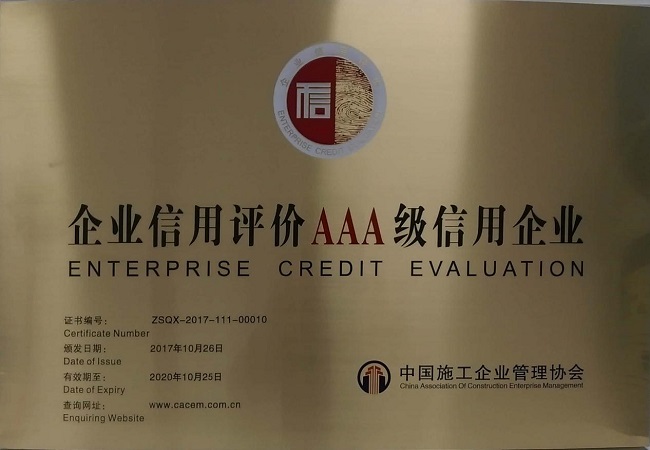 此次公司获评中施企协企业信用评价AAA级信用企业,是外界对我公司管理能力、效益水平、发展前景等综合实力的认可,为提高公司知名度和竞争力增添了新的砝码。