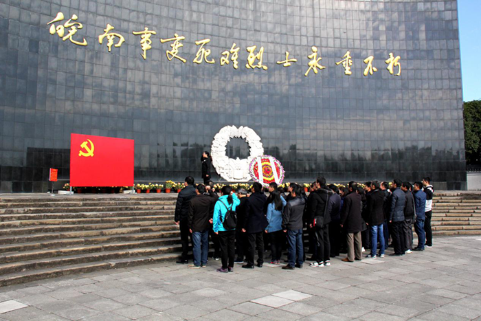 在皖南事变烈士陵园,全体党员瞻仰了皖南事变烈士陵园纪念碑、碑廊。大家一起向革命先烈敬献花篮,并面对鲜红党旗和伟岸的烈士纪念碑,举起右拳庄严宣誓,重温入党誓词。