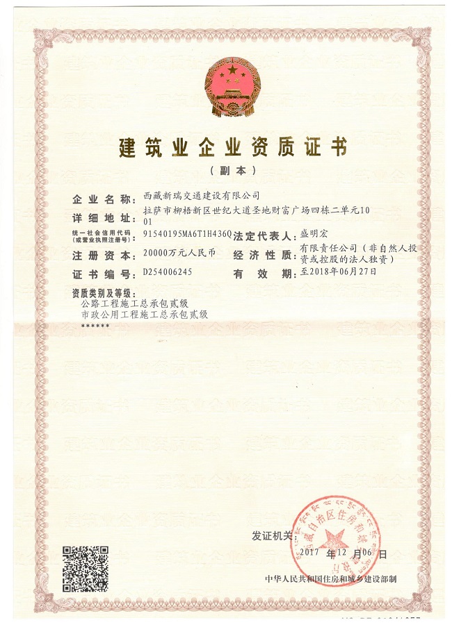近日,安徽省路桥工程集团有限责任公司全资子公司西藏新瑞交通建设有限公司成功取得了市政公用工程施工总承包贰级,圆满完成了2017年资质增项的奋斗目标。