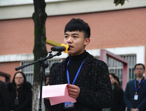 来自成教大专部的王飞同学代表全体学生做了国旗下的演讲,他以“新学期,新起点”为题,号召同学们在新的学期,做一个懂礼貌、讲礼仪的学生,保持身体健康,做一个快乐的学生,做一个会合作、锐意进取的学生,学习雷锋艰苦奋斗、勤俭节约的精神,积极行动起来,把期望播种在春天的土壤里,齐心协力,迎接更美好的明天。