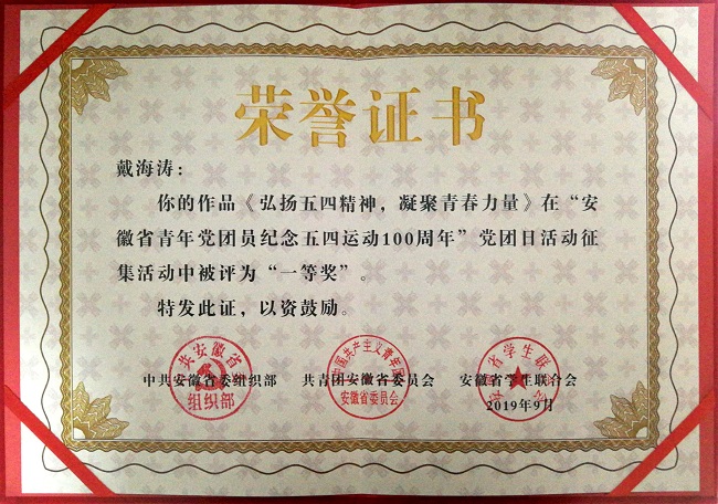 搭建文体活动平台。今年是五四运动100周年,公司团委着眼新时代青年多层次、多方面、多样化文化需求,先后组织“传承五四精神,绽放青春风采”五四青年节活动、“传承五四精神,缅怀革命先烈”纪念五四运动100周年活动、“青春心向党,建功新时代”主题的演讲征文等重大活动,各级团组织也分别组织了参观革命圣地、重温入团誓词、观看红色电影等形式多样、内容丰富、主题鲜明的文体活动,各类活动给公司青年提供了一个自由开阔的展示平台,激发了青年员工参与自由创作、展现青春风采的主动性与积极性。其中公司团委选送的作品获得安徽省“五四运动100周年”红色信息征集评选活动一等奖。