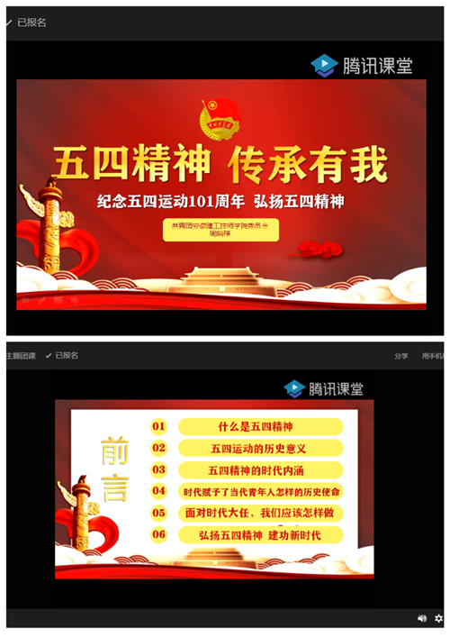 2020年是五四运动101周年。随着疫情防控进入新的时期,安徽建工技师学院团委利用特殊的线上“云团课”方式与团员们一起用全新的方式纪念五四运动,向青春致敬!本次“云团课”以“五四精神,传承有我”为主题,由学院团委书记周晓瑛主持,全院71名学生团干部参加学习。