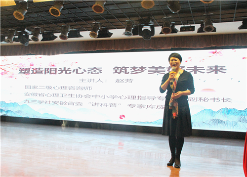 为进一步提高我院学生心理健康意识,增强自我调节能力,营造良好的心理健康氛围,4月21日下午,学院邀请了著名心理健康专家、安徽省心理卫生协会中小学心理专业指导委员会副秘书长赵芳老师在学院大礼堂做题为“塑造阳光心态,筑梦美好未来”心理健康专题讲座。学院党委委员、副院长任建设、五系一部书记、学管人员、专兼职班主任、400余名学生代表参加了培训。讲座由院团委副书记桂萍主持。