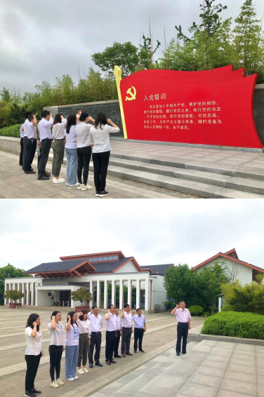 随后,大家沿着红色足迹来到了沈浩同志先进事迹陈列馆,现场认真聆听了沈浩同志的先进事迹,在他担任村领导的六年中,他深入群众、拉近距离、调研走访、摸清村情,用心融入到小岗村。在为小岗村脱贫致富忙碌奔波中,三过家门而不入,吸引大学生进村创业、招商引资办工业、开发旅游促三产等一系列措施,使得小岗村村民生活水平显著提高,文化生活丰富多彩,精神面貌焕然一新。在学习沈浩同志先进事迹时,大家无不为沈浩扎根小岗、克己奉公、干事创业的崇高品质所感动,更加明白了为什么他能成为小岗村乡亲们三次按下红手印留下的好干部、人民好公仆。在陈列馆门前,党员面对鲜红的党旗,重温入党誓词,庄严宣誓。