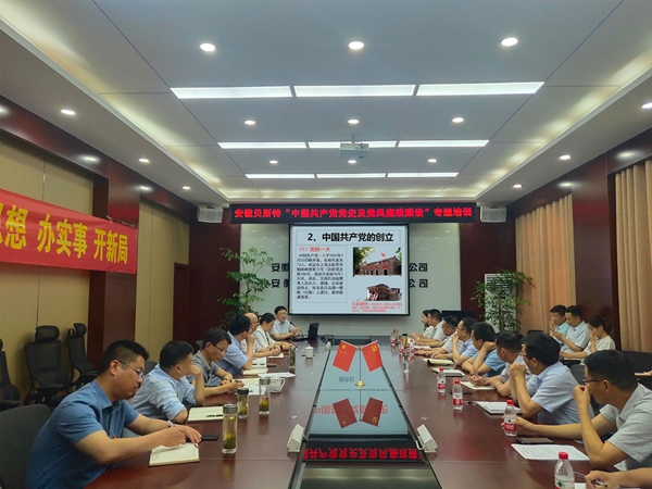 为进一步推深做实党史学习教育活动,提升党员干部理论水平和政治素养,5月28日,安徽水利贝斯特公司邀请中共安徽省委党校政法部副主任、教授戴传利作中国共产党奋斗史暨党风廉政建设培训,引导广大党员干部学史明理、学史增信、学史崇德、学史力行,做到学党史、悟思想、办实事、开新局。公司领导班子,项目书记、项目经理及机关全体党员近50人参加了培训。