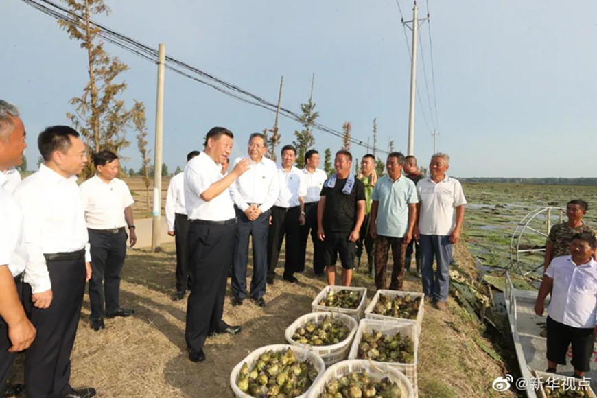 “这一直是我牵挂的事。”18日下午,正在安徽考察调研的习近平总书记来到阜阳市阜南县蒙洼蓄洪区利民村西田坡庄台,顶着炎炎烈日,走进田间地头,深入庄台农户,看望慰问受灾群众。乡亲们告诉总书记:“蓄洪期间,大家住在庄台,电没断、水照供、生活用品有人送。现在水退了,都在抢种补种,水退到哪里,就补种到哪里。请总书记放心!”习近平高兴地说:“我一直牵挂灾区的群众,看到乡亲们生产生活都有着落、有希望,我的心就踏实。”