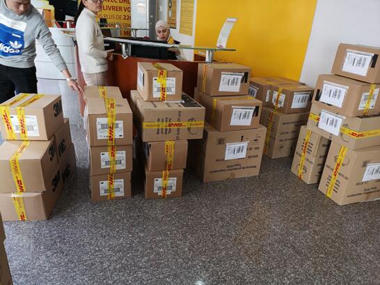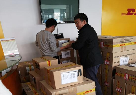 由于采购的防疫物资数量大,而又恰逢周末,货运公司人手不足。为争分夺秒,缩短物资发运时间,采购小组主动前往DHL航空货运公司,协助货运公司工作人员对防疫物资进行分装、打包、贴签。然而难题又出现了,按照货运公司规定,大宗物资必须分批次进行报关发货,这样好不容易采购到的防疫物资就不能全部在第一时间内抵达国内。经过讨论和咨询,并与货运公司反复协商,驻阿经理部决定以公司名义办理报关,并迅速整理递交了报关资料,全力协助DHL货运公司发运防疫物资,最大限度确保防疫物资尽快运抵国内。