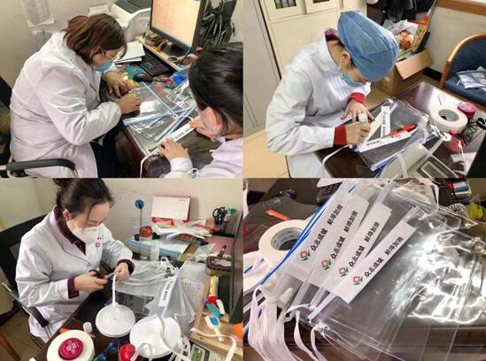 在医院部分防护物资短缺的情况下,为了加强医护人员的自身防护,降低被感染的概率,青年突击队成员们共同努力出谋划策,利用文件袋、透明塑料薄膜制作成防护面罩,有效地缓解了防护用品短缺的难题。