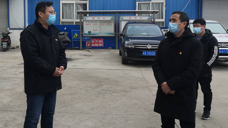 2月14日上午,固镇县住建局局长陈大鹏赴安建建设公司第四工管部检查指导疫情防控工作,第四工管部负责人卢朋陪同。