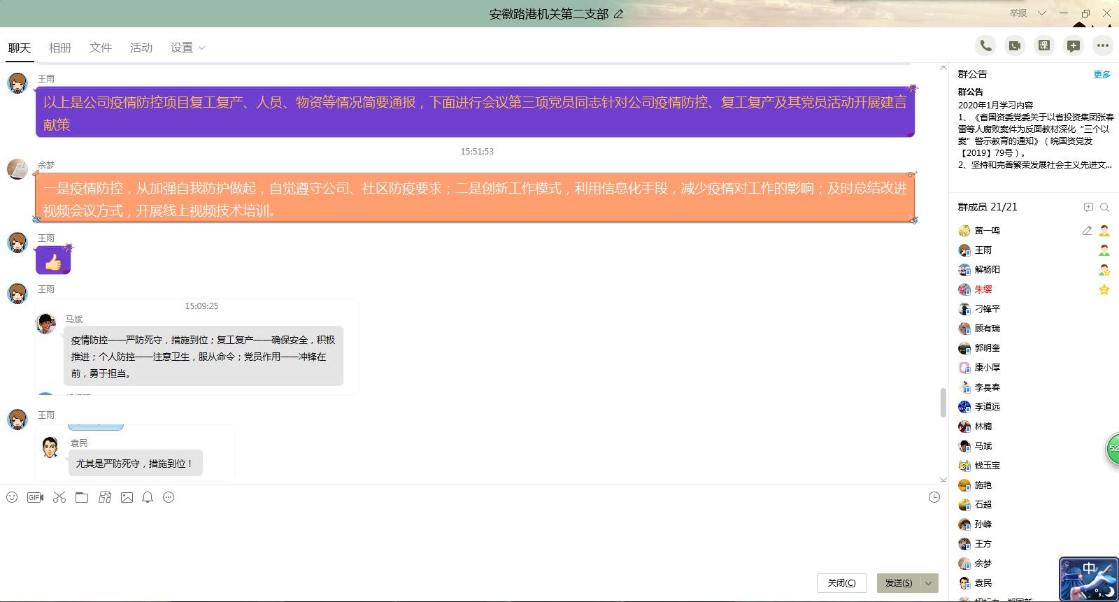 各党支部以现场学习和视频会议等方式,学习习近平在统筹推进新冠肺炎疫情防控和经济社会发展工作部署会议上的讲话精神、集团防疫复工复产会议精神、公司《关于加快疫情防控期间项目复工工作的通知》、《复工后新型冠状病毒感染肺炎疫情防控知识手册》等内容。