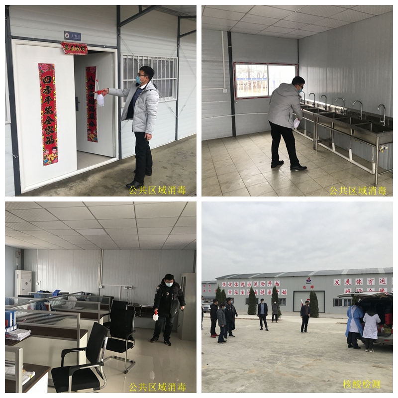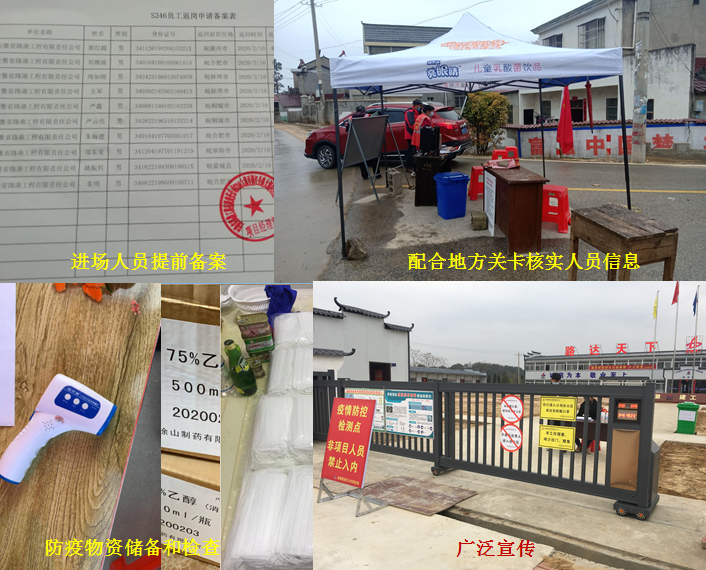 一是所有人员在返岗时均要求提前申报返岗信息,项目部对人员开展健康承诺登记、14天行程轨迹及健康码留存等措施。二是积极联系太湖县防疫指挥部进行咽拭子核酸检测,大大缩短了隔离14天的硬性规定。三是施工现场严格执行规范佩戴安全用具及口罩规定。四是班组储备足够的防疫物资。五是每天对公共区域定时消毒,食堂实行分时分餐制。六是每天检测进场人员体温,在醒目位置张贴宣传画,悬挂标语,广泛宣传疫情防控知识。七是采取值班制,不定期检查班组物资储备及施工人员个人防护情况,强化疫情防控工作的监督,为实现全年目标任务而攻坚克难。