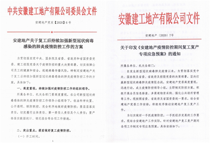 为切实做到“一手抓疫情防控,一手抓经济发展”,安建地产先后发布了《关于复工后持续加强新型冠状病毒感染的肺炎疫情防控工作方案》、《安建地产疫情防控期间复工复产专项应急预案》,要求各单位持续做好复工疫情防控,合理组织复工复产。所属各在单位积极响应,结合实际情况制定了科学的复工复产方案,吹响安建地产复工“集结号”!