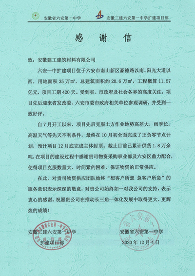 日前,公司收到安徽省六安第一中学感谢信,信件表达了对安建建材“想客户所想,急客户所急”高质量供应服务的充分认可,充分肯定了公司的资源整合及保供能力。